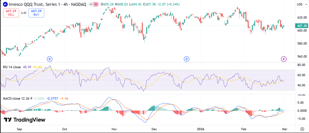 QQQ ETF closed at $609.24 on the last market day. It fell 1.55% over the past day from 616.83. The 5-day trend shows a 1.38% rise from a low of 599.05, but recent pullback. In one month, QQQ ETF price gained 2.35% from 593.34, though down 4.60% from January peak at 636.60.