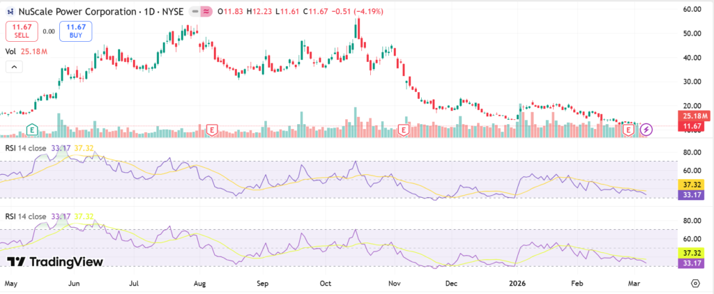 As of the last market close on March 6, 2026, SMR stock price stands at around $11.70. It dropped 2% in the 1-day period amid sector volatility. The 5-day trend shows a 5% decline, reflecting post-earnings weakness. Over 1 month, SMR stock price fell 8%, erasing early gains. The 3-month trend is down 15%, while 6-month performance slid 20% from peaks. Year-to-date in 2026, it’s lower by 18%. The 52-week high hit $57.42, and the low was $11.08. This bearish trend signals caution for investors, as momentum fades despite long-term nuclear demand.