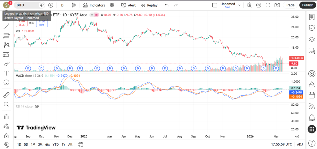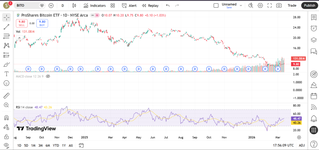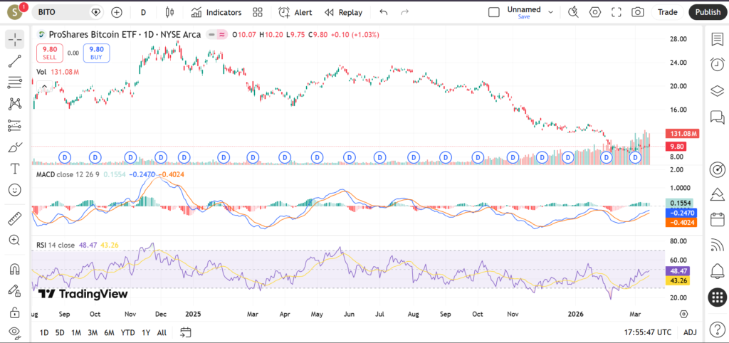 Traders are paying close attention to BITO in March 2026 as Bitcoin continues to attract both institutional and retail interest following several years of mainstream adoption and regulatory developments. Because BITO tracks Bitcoin futures, its price behavior tends to mirror broader crypto market sentiment. In this article, we will examine BITO’s current trend, important support and resistance levels, and key technical indicators including RSI, MACD, and trading volume to help traders understand how the chart is evolving during this period.