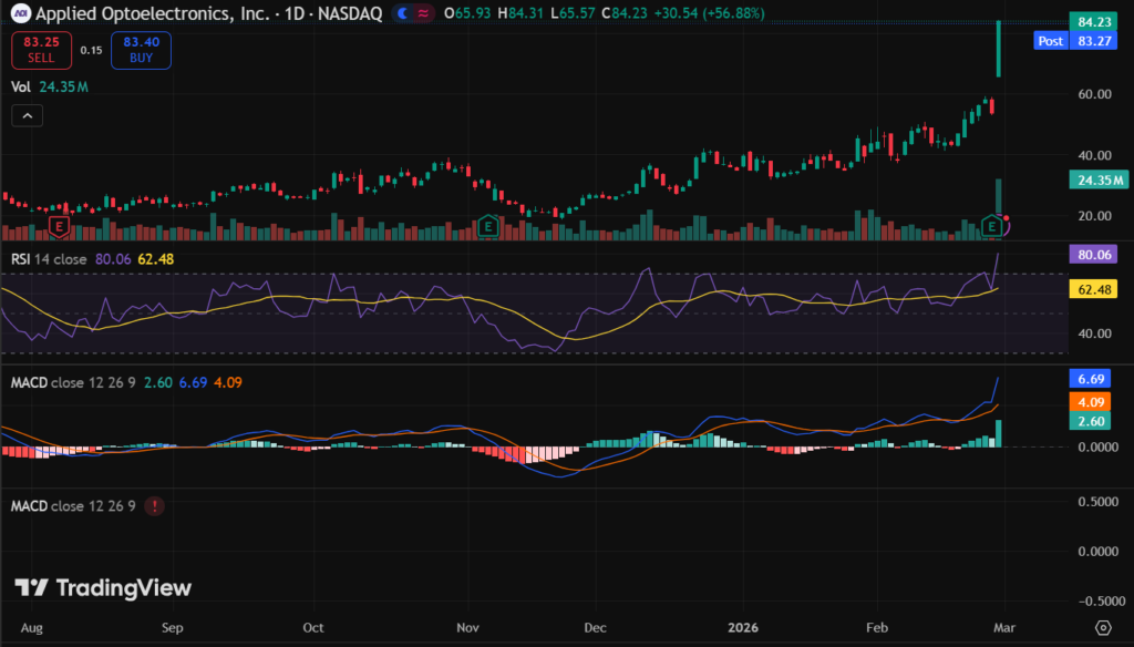 AAOI closed at $58.12 February 27, up sharply post-earnings from day’s low $52.85 to high $58.98. One-day gain ~20%+ on volume 5.5M shares, reflecting beat reaction.