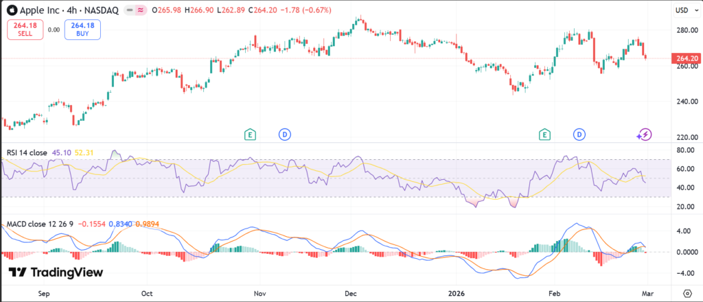 Over one day, it fell about 3.5% from the prior close of $272.95. The five-day trend shows mild pullback amid market jitters. In the past month, AAPL stock gained roughly 2-3% as buyers stepped in after dips.