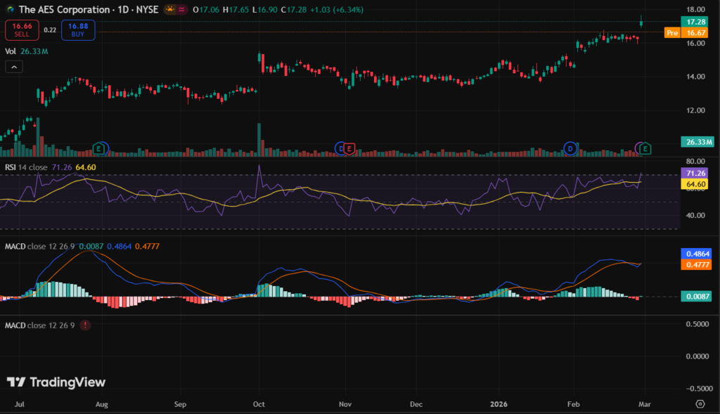 AES stock closed at $17.26 on March 2, 2026.