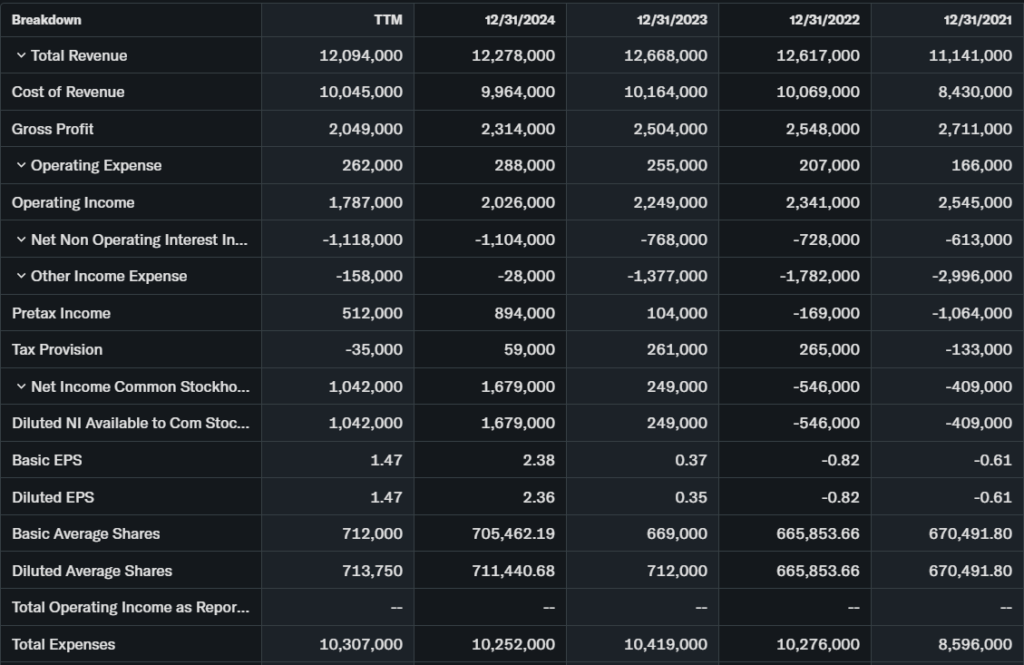 TTM revenue $12.09B, down 1.5% YoY; EPS $1.46, down 6.7%. Debt/equity 3.03, current ratio 0.72.