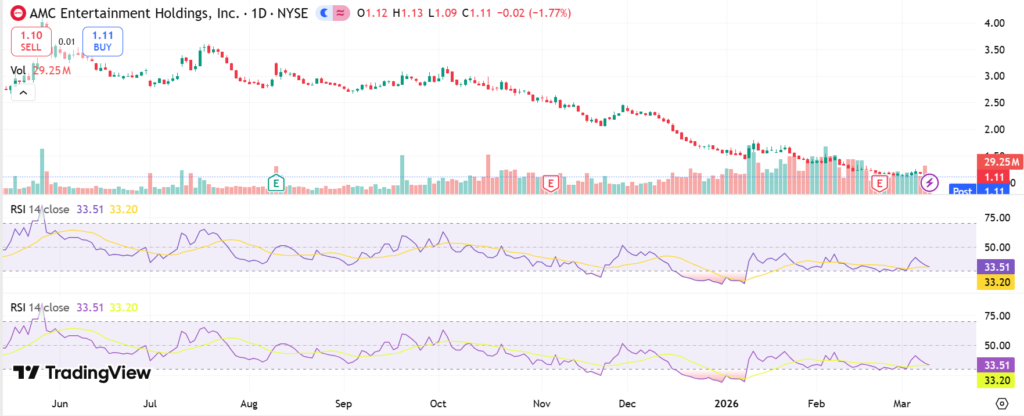 AMC stock closed at $1.14 on March 10, 2026, using last market data. It fell 3.42% that day amid market dips.