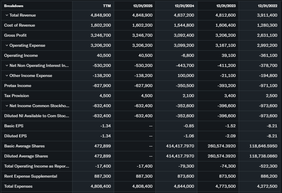 Trailing P/E N/A (EPS -$1.41 TTM); forward P/E unavailable absent profitability path. Price-to-sales ~0.3x depressed reflecting revenue sustainability doubts.