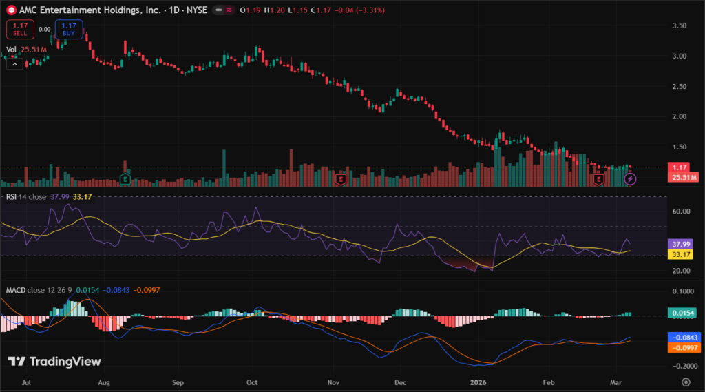AMC stock closed at $1.18 on March 4, 2026 (last market close data), up 4.42% ($0.05) from $1.13 prior day on high volume. After-hours traded $1.17 (-0.87%). Day range $1.14-$1.18 showed tight action.