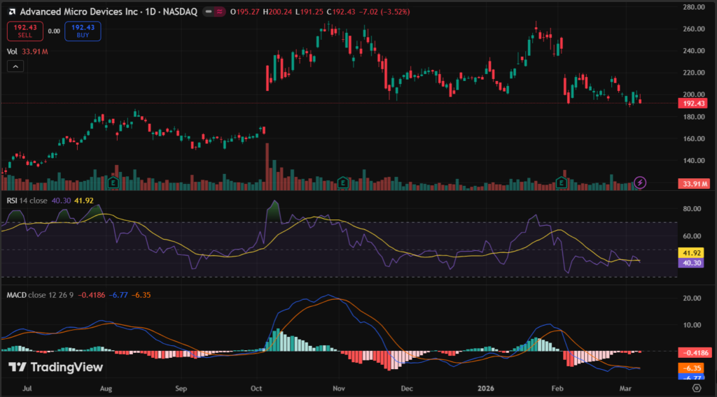 AMD stock closed at $192.43 on March 6, 2026 (last market close data), down 3.52% ($7.02) from $199.45 prior day on 33.85 million shares volume. Day range hit $191.25 low and $200.24 high.