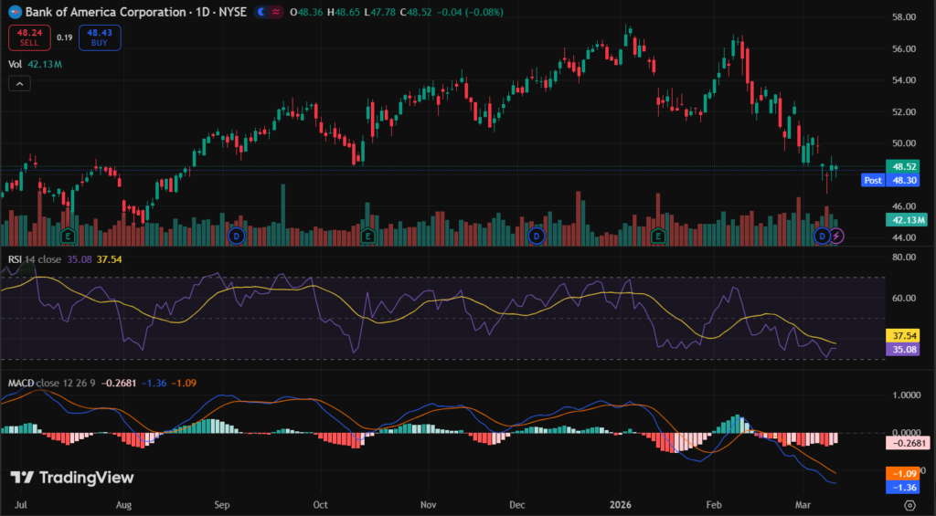 BAC stock closed at $48.56 on March 10, 2026 (last market close data). It gained 1.38% that day. Five-day trend up 2.1% from $47.55 lows.