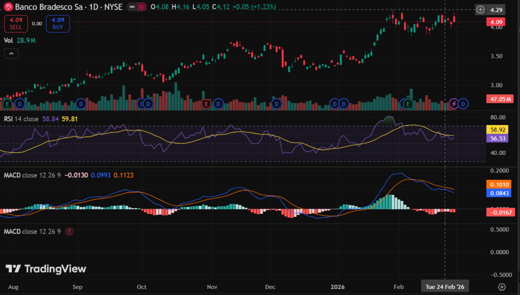 BBD stock closed at $3.36 recently. Volume hit 58 million shares, above average.