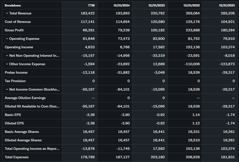 Revenue FY $193M flat YoY; EPS -$2.10 deep loss. Free cash flow negative; net loss $32M. Debt heavy; cash thin.