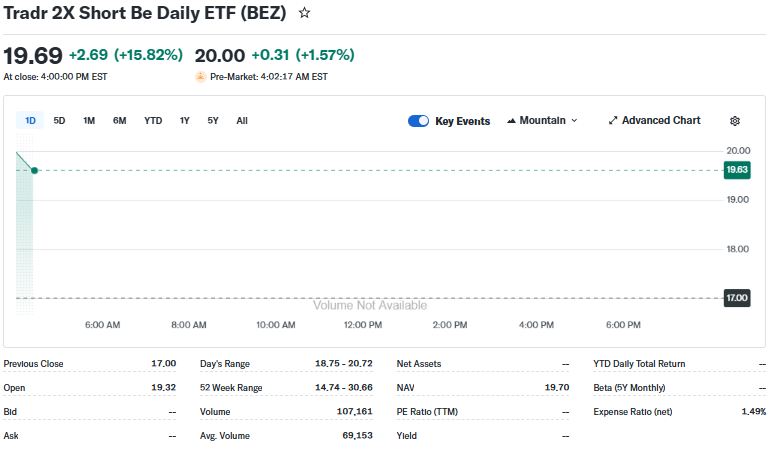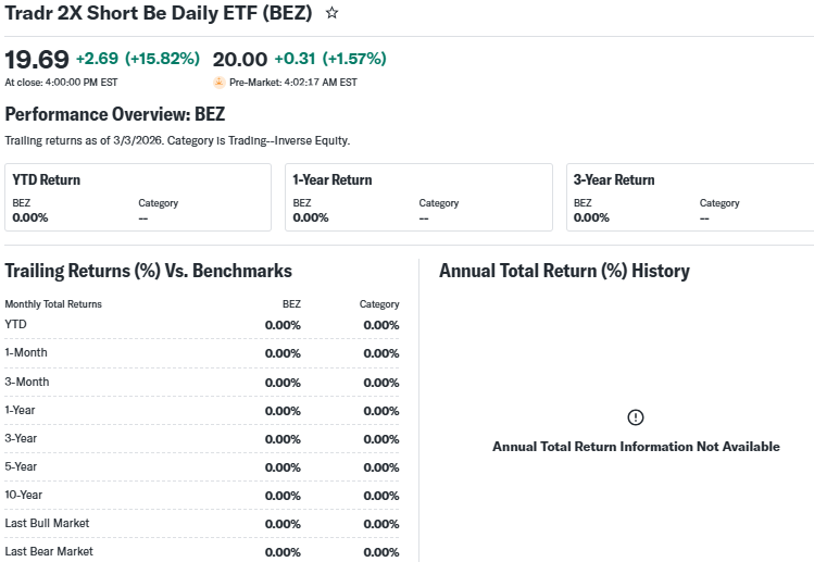 The BEZ ETF, or Tradr 2X Short BE Daily ETF, aims to deliver twice the inverse daily performance of a benchmark index tied to US large-cap equities. Launched on February 10, 2026, it lets investors bet against broad market gains.