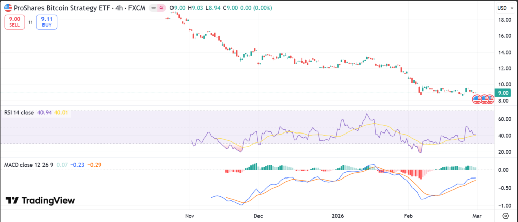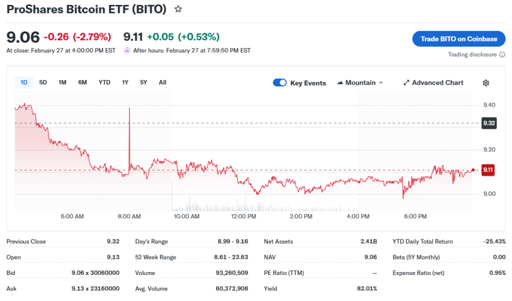 BITO ETF closed at $9.06 on February 27, 2026, down 2.78% or $0.26 from the prior day. The one-day drop reflects Bitcoin futures weakness. Over five days, it rose about 3% from lows near $9.06, showing short-term bounce.
