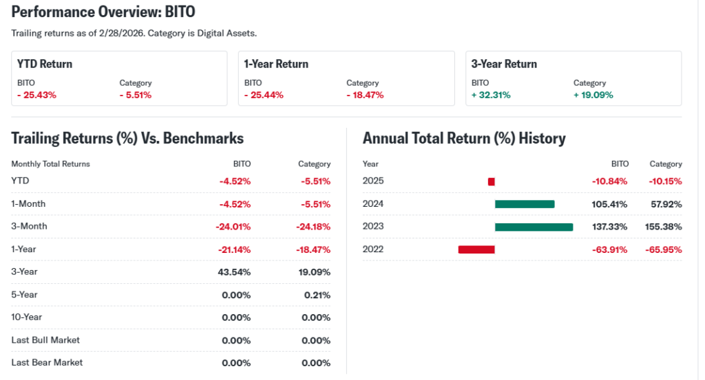 Catalysts: Bitcoin halving effects linger; ETF approvals boost flows. Regulatory clarity under current admin aids crypto. These drove past highs but recent BTC dips hit BITO hard.