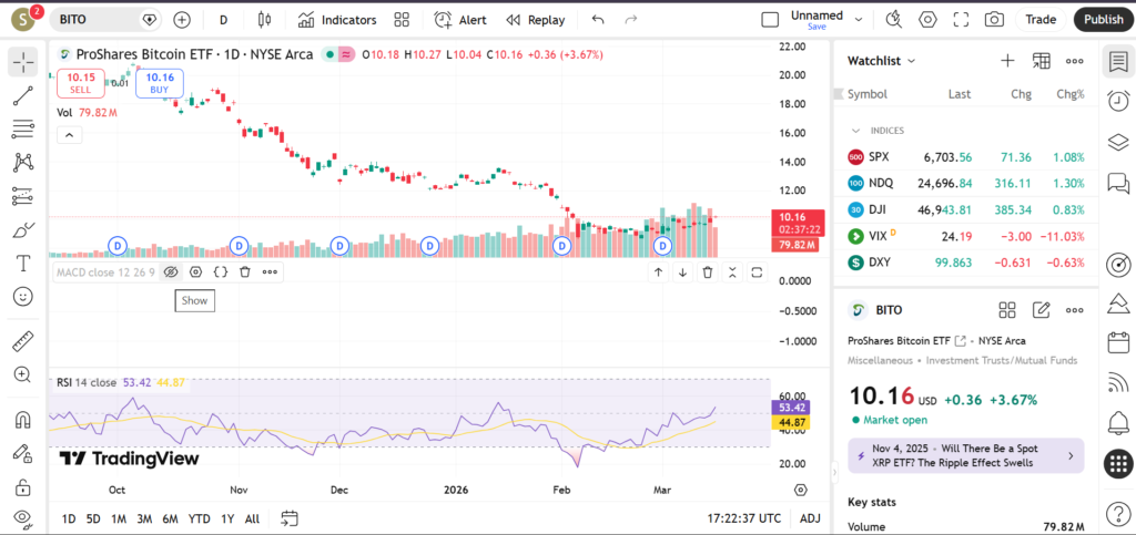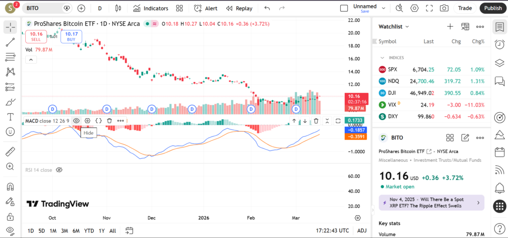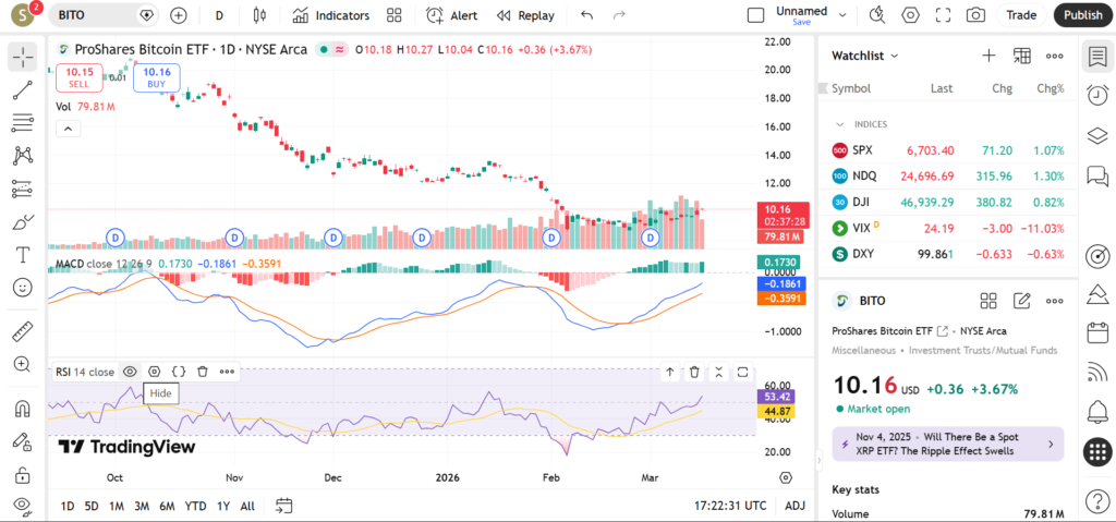 In March 2026, BITO continues to attract strong attention from retail traders and institutional investors as Bitcoin volatility remains a major driver of market sentiment. The ETF often mirrors the broader direction of the crypto market, though futures-based structures can sometimes produce slight differences in price movement compared with spot Bitcoin. This article explores BITO’s technical structure for March 2026, focusing on price trend behavior, major support and resistance levels, and technical indicators such as RSI, MACD, and trading volume.