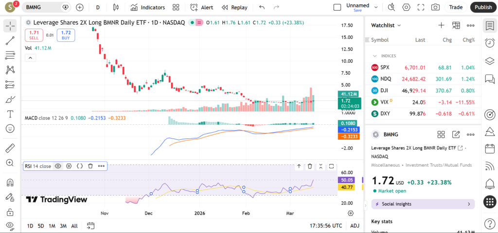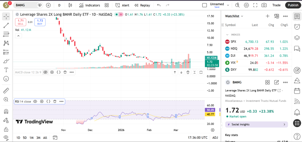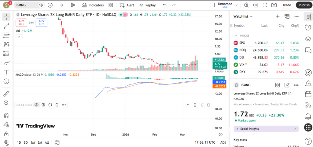 In March 2026, BMNG has attracted attention due to increased volatility in its underlying market. Leveraged ETFs like BMNG tend to move sharply during periods of strong momentum, making them appealing to active traders. This article explores BMNG’s current trend, key support and resistance levels, and signals from technical indicators such as RSI, MACD, and volume.