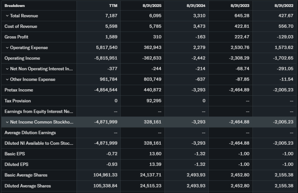 Revenue grew 79.7% YoY to $7.19M TTM; EPS -46.42. Free cash flow negative; debt low, cash strong from ETH ($14B assets).