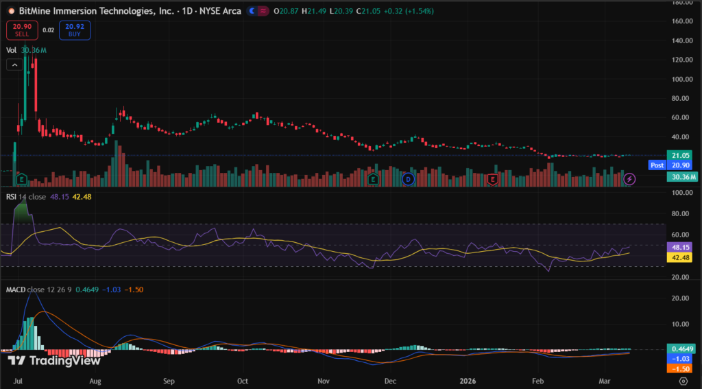 BMNR stock closed at $21.12 on March 4, 2026 (last market close data). It gained 7.92% that day. Five-day trend up 15% from $18 lows.