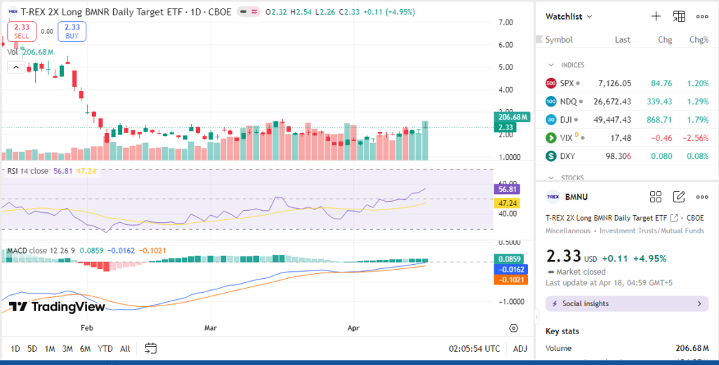 The bullish case starts with leverage. If BMNR has a strong up day, the BMNU ETF can rise much faster. That makes it attractive for traders who want amplified exposure to a sharp upside move.