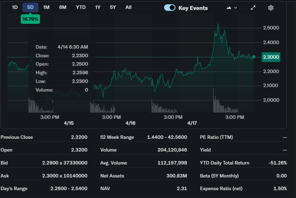For performance, Yahoo Finance shows a YTD daily total return of -53.56%. The 52-week range reported in market data runs from about $1.44 to $42.56, which shows extreme volatility. The short-term trend is best described as bearish, because the ETF is trading far below its higher historical levels and below key moving averages.