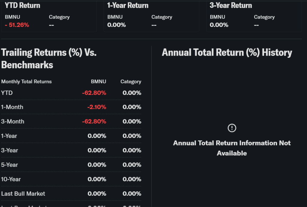 That trend tells investors the BMNU ETF is highly momentum-driven. A sharp bounce can happen quickly, but so can another large drop. For that reason, trend traders usually treat BMNU as a tactical position, not a core holding.
