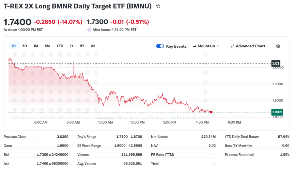 ETFs report no quarterly earnings; BMNU ETF ties to BMNR index performance. No revenue/EPS beats to note.