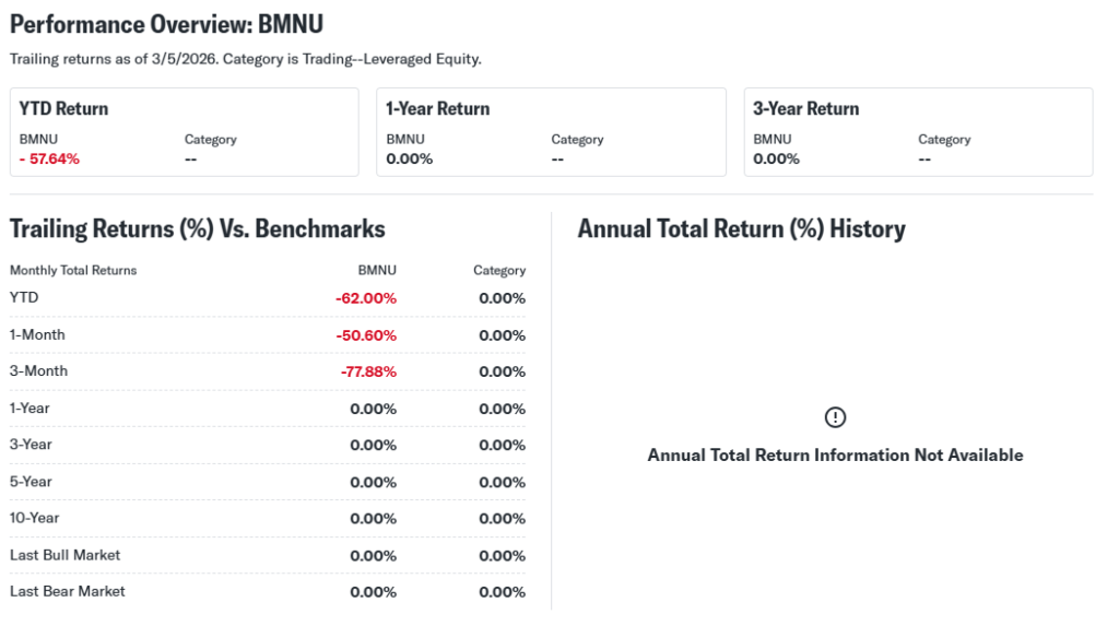 BMNU ETF skips standard ratios like trailing P/E, as it’s leveraged, not equity-based. Focus falls on tracking error to BMNR 2X daily.
