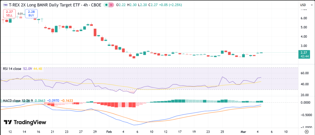 From a technical‑analysis standpoint, BMNU ETF is best treated as a short‑term instrument, not a long‑term holding, because of its intraday leverage reset. Support levels for BMNU appear clustered in the 1.60–1.80 range, where the ETF has recently bounced, suggesting that price declines may stall there unless BMNR index breaks lower again. Resistance sits near the 2.20 area, where the ETF has turned lower in the past, and then again around 2.50–3.00 where earlier pullbacks capped rallies.