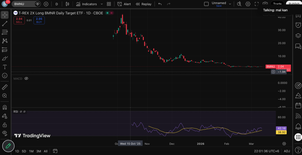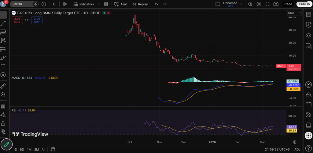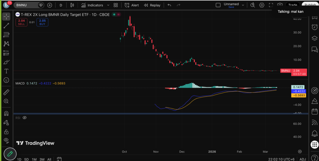 In March 2026, BMNU is trading at a low absolute price (around the low single digits) after a prolonged drawdown, with daily candles showing sharp intraday moves and gaps that reflect both BMNR’s volatility and the compounding effect of 2x daily leverage. This article will walk through the current short‑term trend, key support and resistance levels, and what RSI, MACD, and volume are suggesting for traders monitoring BMNU in March 2026.