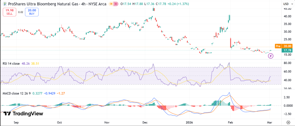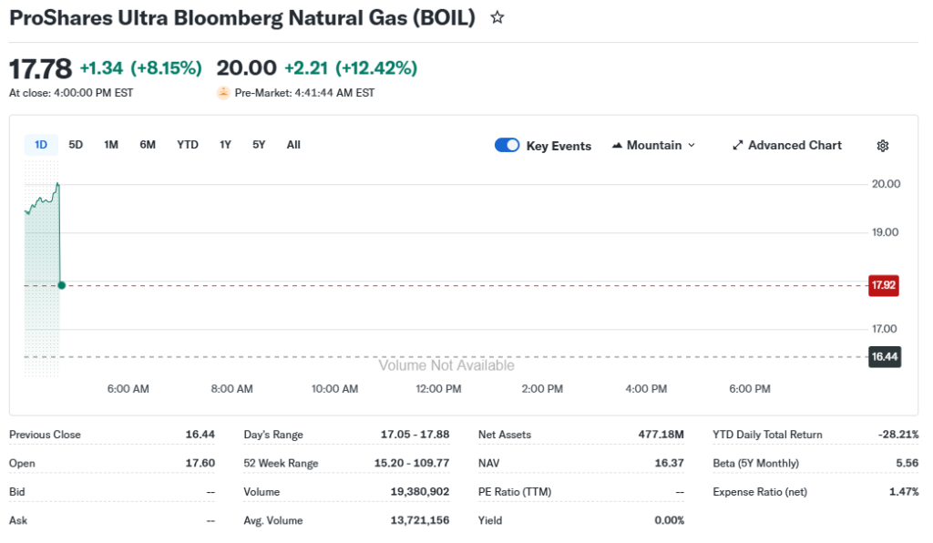 BOIL ETF closed at $17.79 on March 2, 2026, up 8.21% from the prior day’s $16.44. The 1-day gain showed strong buying amid futures rally.