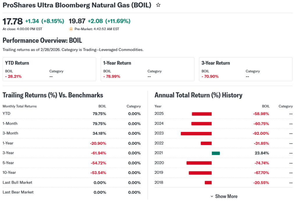ETFs like BOIL report no quarterly earnings, revenue, or EPS. Performance ties to Bloomberg Natural Gas Subindex, holding March 2026 futures at 100%.
