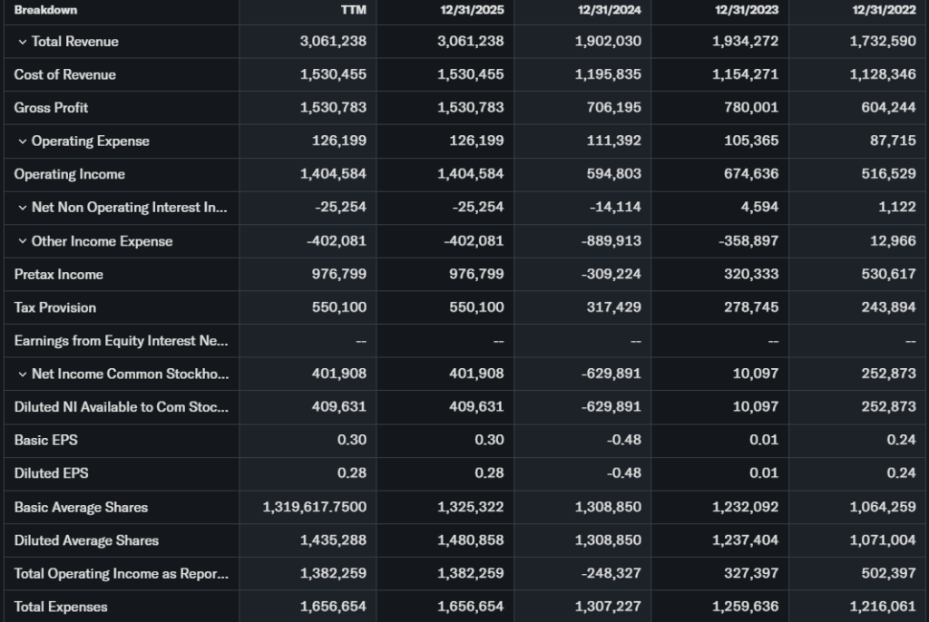 Revenue grew 110.9% YoY to over $3 billion in 2025. EPS matched that surge. Free cash flow strengthened with $52.3% gross margins. Debt is manageable, cash solid.