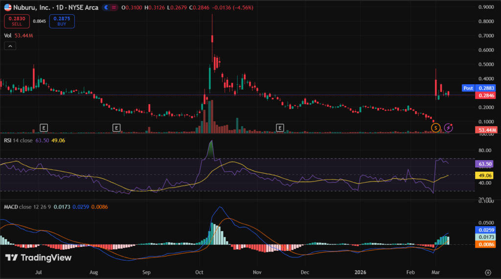 BURU stock traded at $0.30 on March 6, 2026, using last available market data. It climbed from $0.27 low to $0.33 high that week. Volume exploded to 18 million shares.