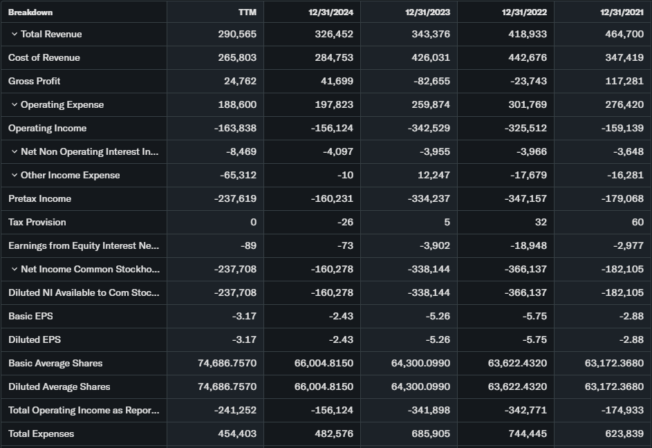 Trailing P/E negative at -0.31 due to losses. Forward P/E also unfavorable amid margin erosion.
