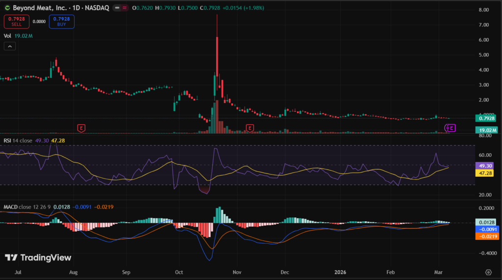 BYND stock closed around 0.78 USD on March 7, 2026 (last market close data), up 3.6% from its daily low of 0.75 USD. Shares traded as high as 0.79 USD that day on 130K volume.