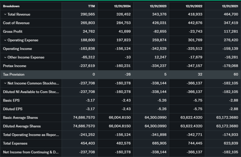 ​Revenue growth negative YoY at -5% to $326M in 2024. EPS $-3.18 TTM, worsening.