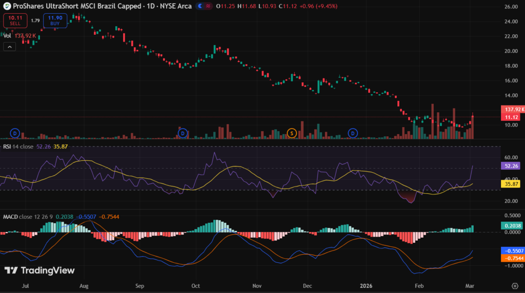 Watchlist BZQ ETF for hedges. Gains possible in Brazil weakness but decay dominates. Short-term traders only.
