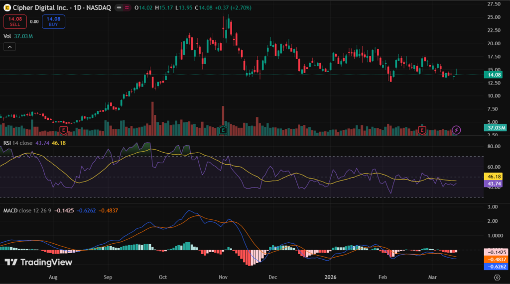 CIFR stock closed at $14.08 on Friday March 13, 2026, up 2.7% from $13.71 previous session on 37 million shares volume. Five-day trend volatile down 9.74% from $15.64 March 5 highs. One-month performance down 14.3% amid sector rotation.
