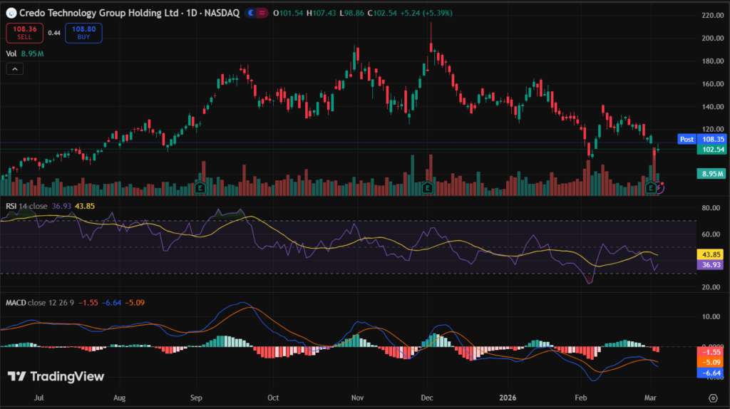 CRDO stock closed March 4, 2026 at $102.54, up 5.39% from $97.30 prior close. Daily range $98.86-$107.38 shows 8.62% volatility. Volume 1.47 million shares.