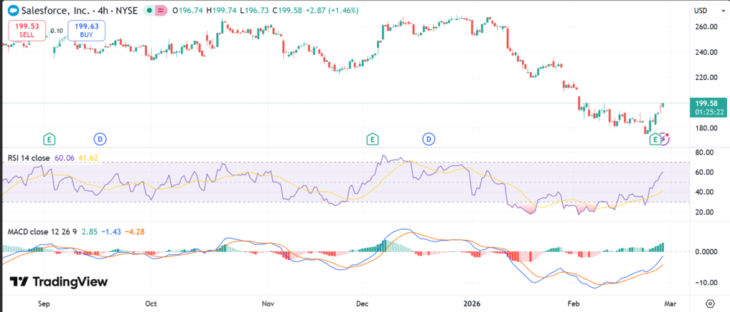 The 5-day trend shows a 1.52% gain, while the 1-month up 7.35%. Over 3 months and 6 months, it declined amid sector pressures. Year-to-date, CRM stock fell 28.40% from January peaks.