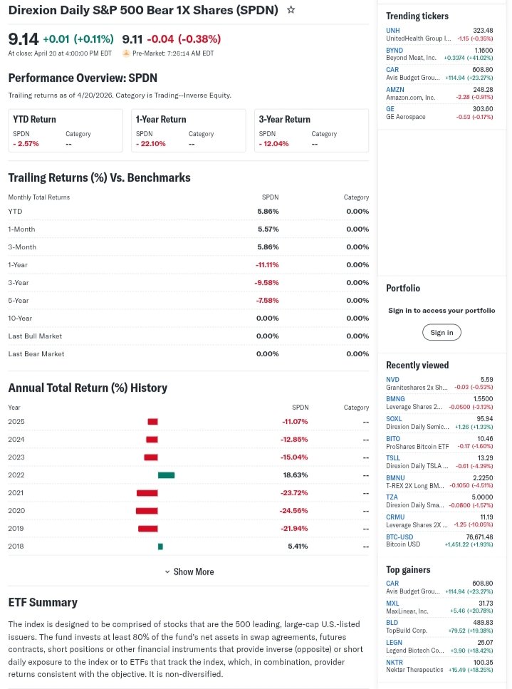 SPDN’s net expense ratio is roughly 0.48%, which is competitive for an inverse ETF but still adds pressure over time for buy‑and‑hold use. The fund’s NAV was about $9.12 per share as of mid‑April 2026, very close to its market price, indicating tight tracking between the two.
