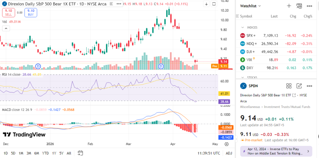 At the last market close on April 21, 2026, the SPDN ETF price was about $9.14 per share. On that day, the ETF was up roughly 0.1% versus the intraday low and slightly below the day’s high of about $9.18, reflecting a narrow trading range.