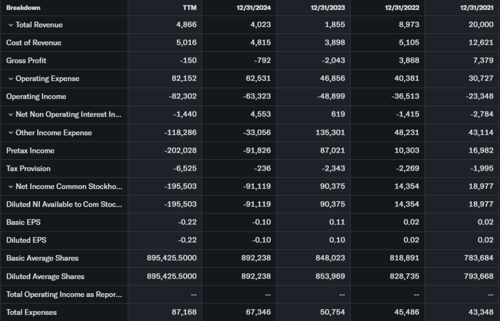 Trailing P/E stands negative at -26.00 due to losses; forward P/E not available yet. Price-to-sales at 1,027—high for explorers.