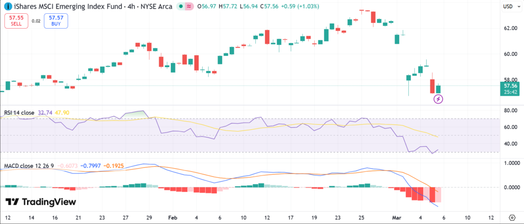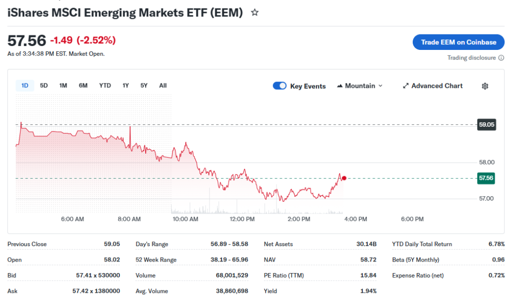 As of last market close on March 3, 2026, EEM ETF price stood at $58.42. It fell 4.92% that day to $58.72 NAV amid profit-taking.