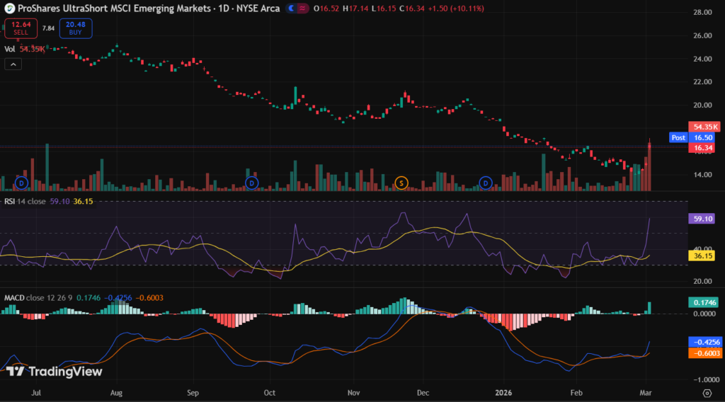 Watchlist EEV ETF for short-term hedges. Gains possible during EM corrections but structural decay limits appeal. Best for experienced traders.