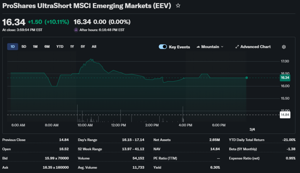 EEV ETF targets -2x daily returns of the MSCI Emerging Markets Index. It rises when EM stocks fall, serving as a hedge tool. Investors watch EEV ETF now amid China stimulus and EM rallies. Broader markets face U.S. tariffs and currency wars impacting inverse funds.