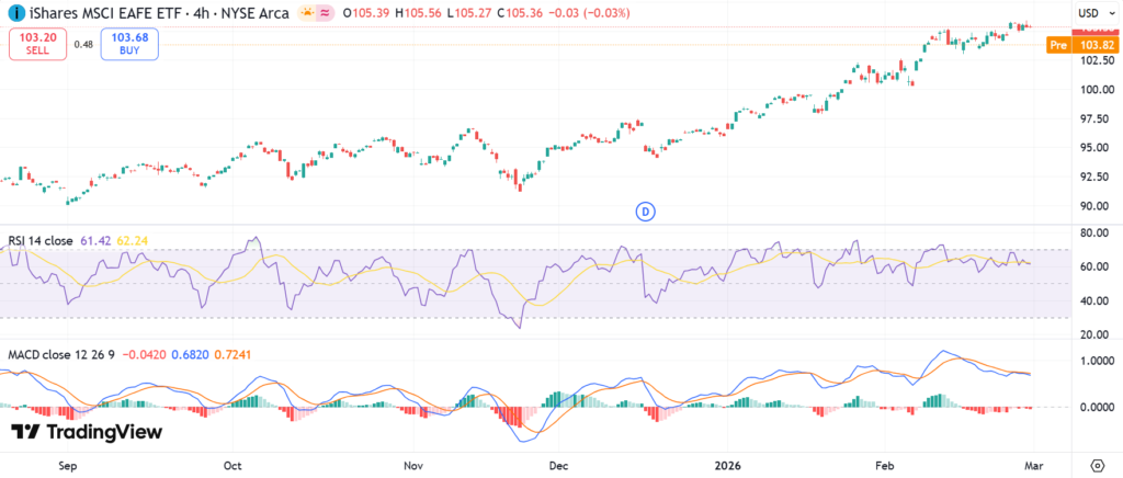 The 52-week range spans $72.15 low to $105.94 high, near the top now. Overall trend looks bullish with consistent gains. This signals strength for investors seeking international exposure, though volatility lingers from global events.