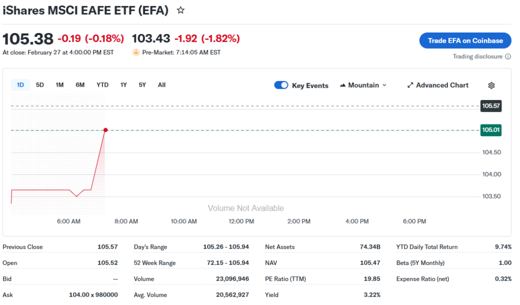 EFA ETF closed at $105.24 on the last market session. It saw a 0.52% gain over the prior day amid steady volume. The 5-day trend shows a 0.52% rise, reflecting short-term stability above recent averages.