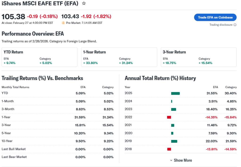 Over one month, EFA ETF price climbed about 3.58%, beating some benchmarks. The 3-month gain hit 4.61%, while 6-month performance reached 13.78% from August lows. Year-to-date in 2026, it advanced 9.11% from $96.51.