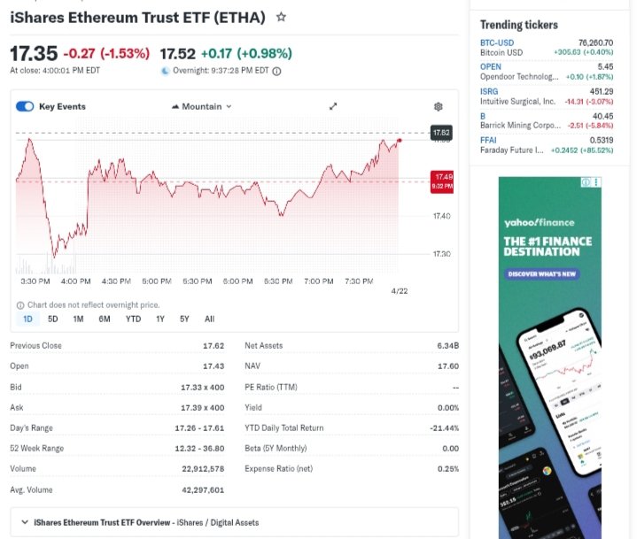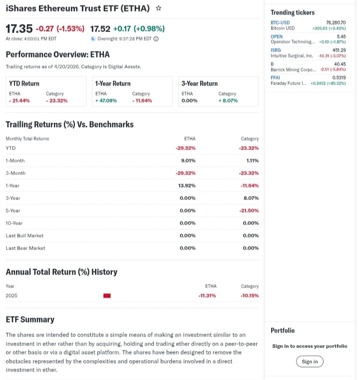 As of the latest market close, ETHA ETF price is approximately in the mid $20–$30 range, closely tracking Ethereum price movements.