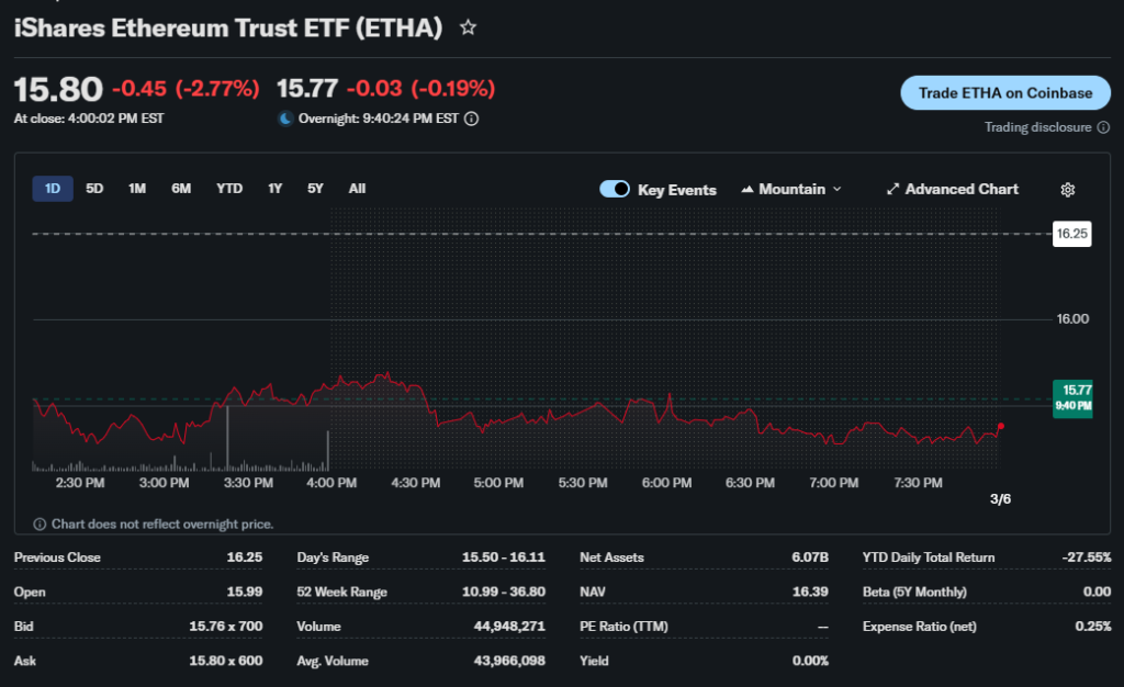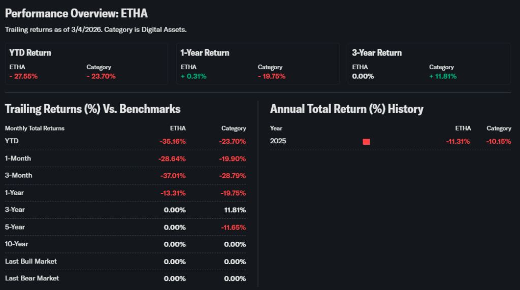 ETHA ETF closed at $16.39 NAV on March 4, 2026, after a 9.45% daily jump.